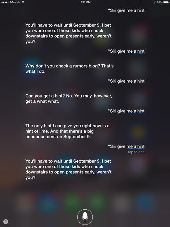 8月28日消息,CNET記者:“當我問(wèn)他蘋(píng)果9月9日發(fā)布會(huì )邀請函上的那個(gè)問(wèn)題時(shí)——‘give me a hint’,Siri給了我個(gè)驚喜。”